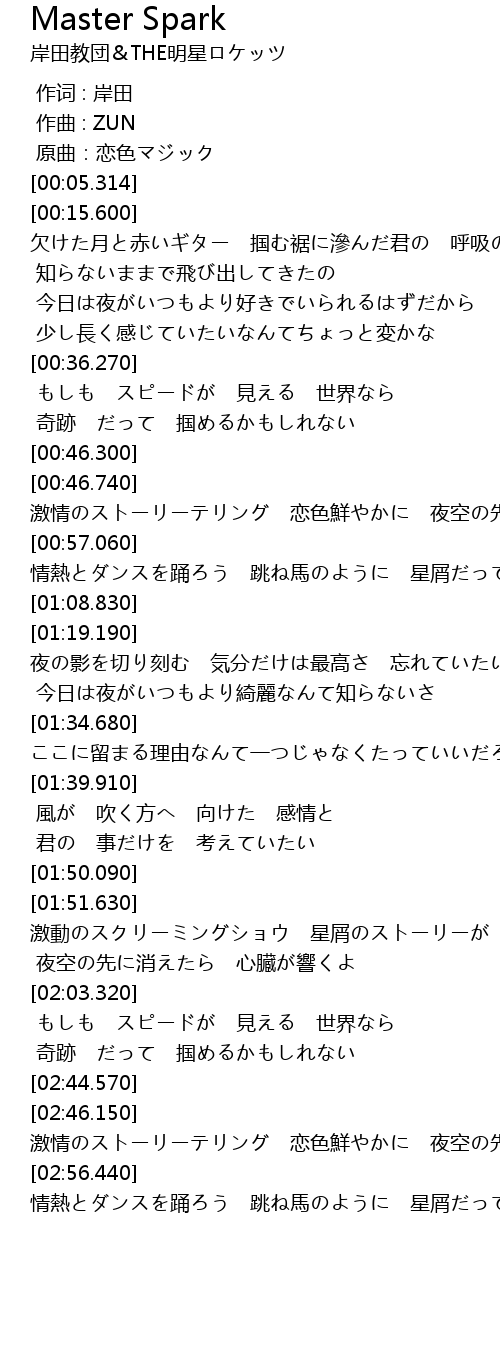| [02:46.150] | 激情のストーリーテリング 恋色鮮やかに 夜空の先に向けたら 星空になるって |