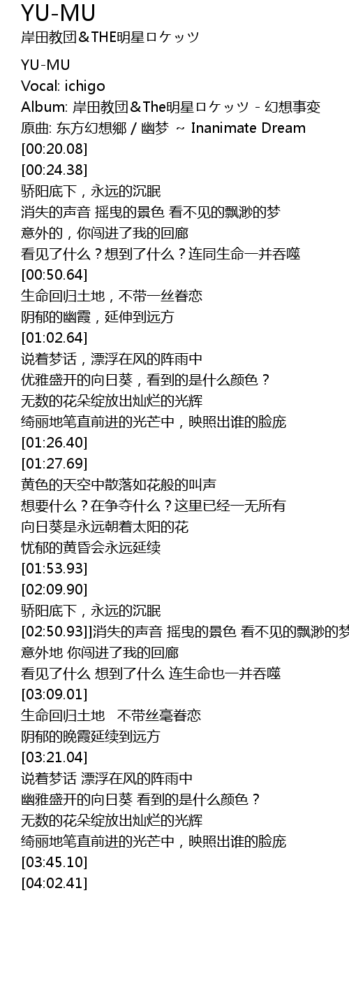 | [00:08.78] | Album: 岸田教団&The明星ロケッツ - 幻想事変 |