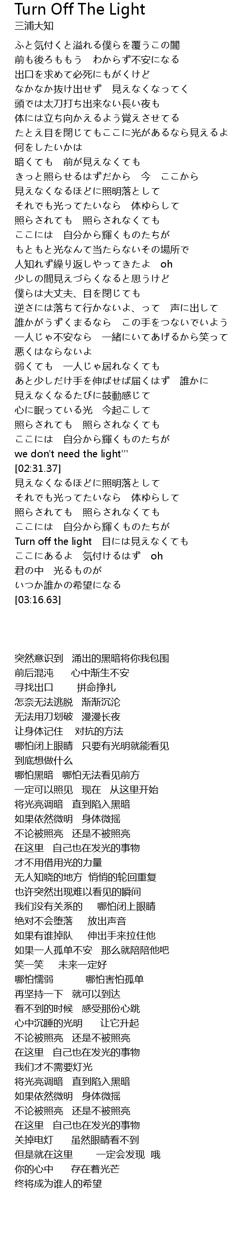| [02:58.95] | Turn off the light 目には見えなくても |