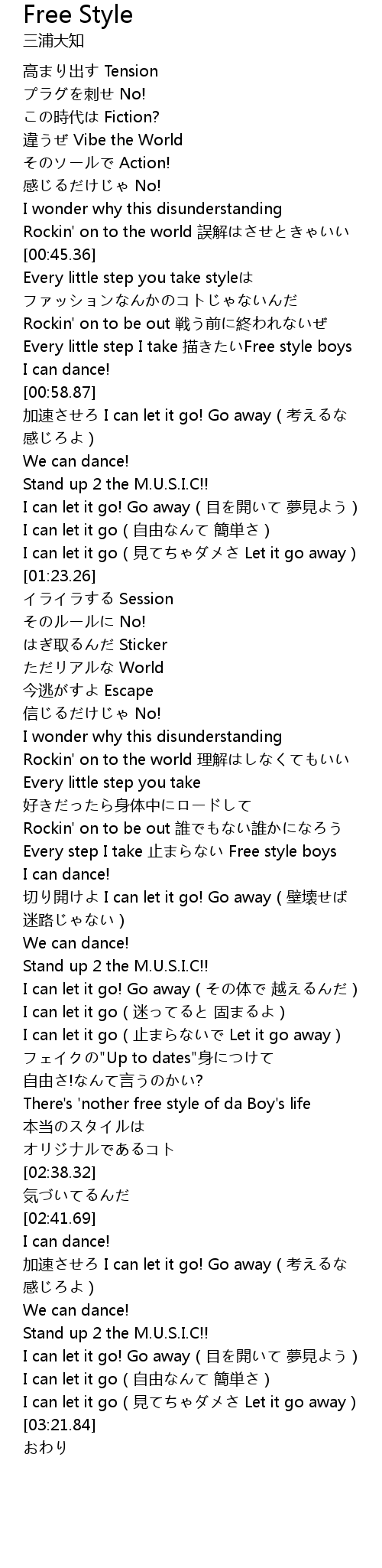 | [00:53.41] | Every little step I take miáo Free style boys |