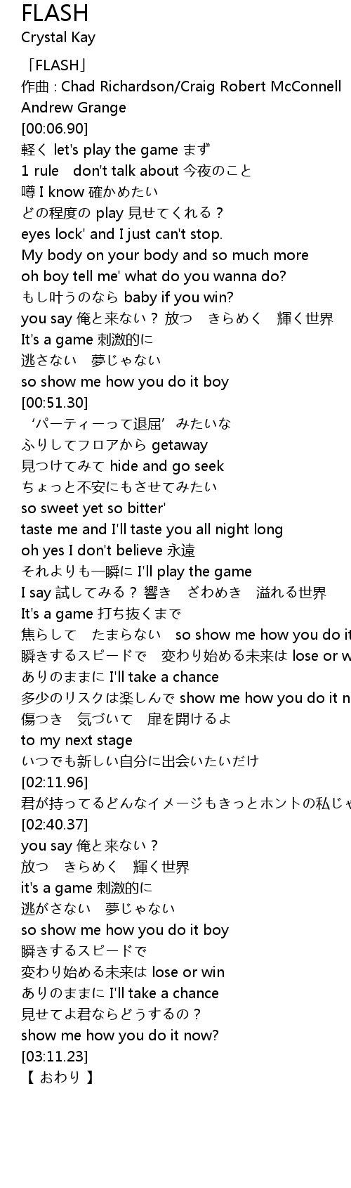 | [01:42.34] | 瞬きするスピードで 変わり始める未来は lose or win |