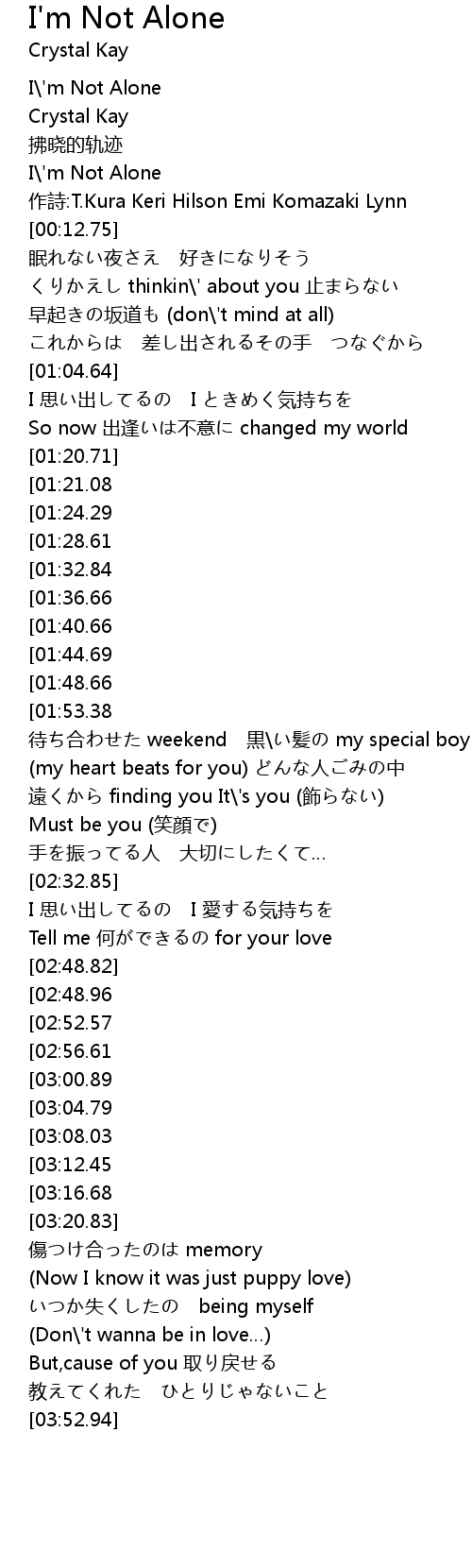 | [04:18.59][01:44.69] | ひとりの時間も(I\'m not alone) |