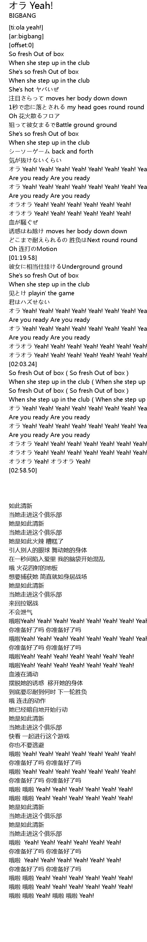 | [02:41.18] | 哦啦 哦啦 Yeah! Yeah! Yeah! Yeah! Yeah! Yeah! |