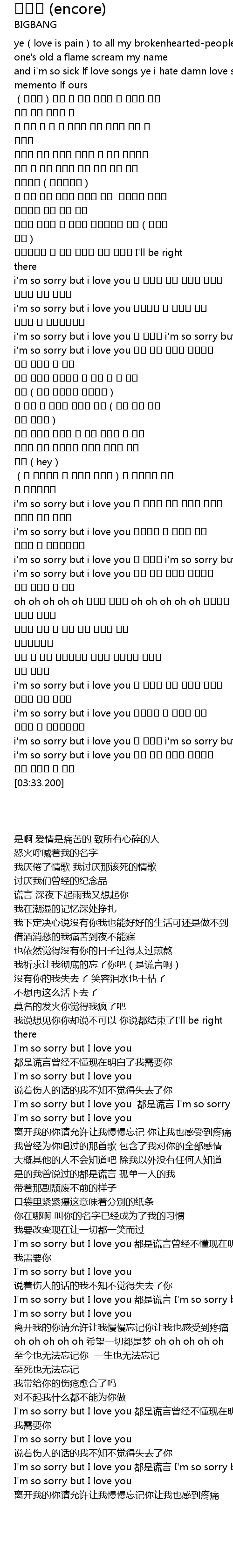 | [03:18.500] | i'm so sorry but i love you 다 거짓말 i'm so sorry but i love you |