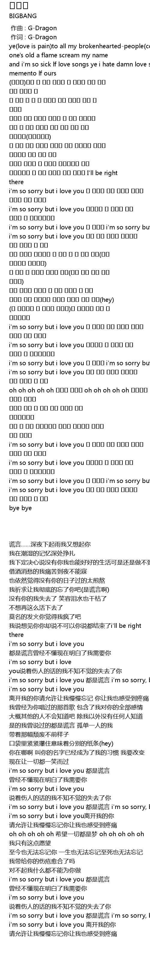 | [02:12.599] | i'm so sorry but i love you 날카로운 말 홧김에 나도 모르게 너 떠나보냈지만 |