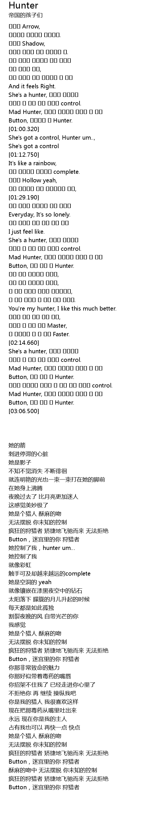 | [01:44.130] | She's a hunter, 짜릿한 입맞춤에 |