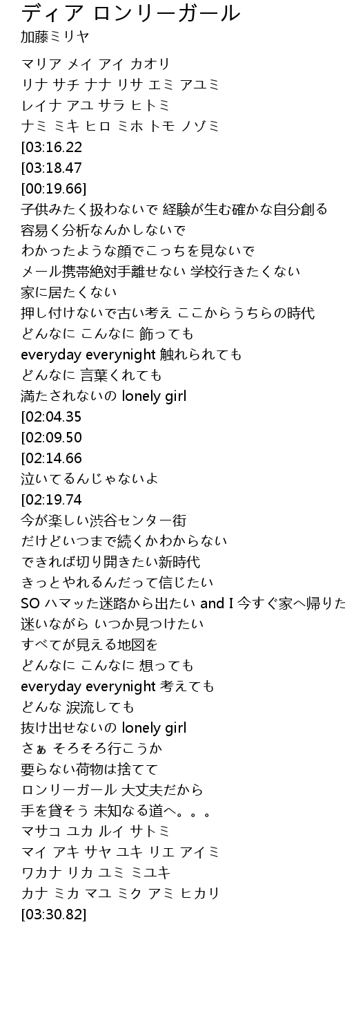 | [01:03.56][02:04.35][02:45.21] | ロンリーガール 寂しいんじゃないよ |