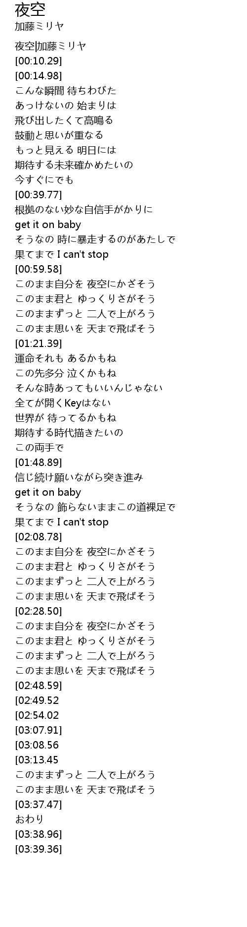 | [00:00.58] | 夜空|加藤ミリヤ |
