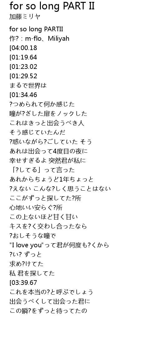 | [00:13.00][04:00.18] | 加藤ミリヤ-for so long PARTII |