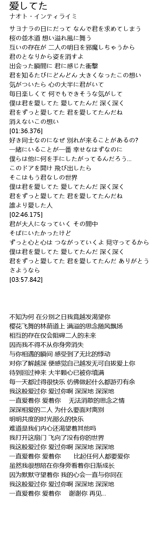 | [03:38.498] | 君をずっと愛してた 君を愛してたんだ ありがとう さようなら |