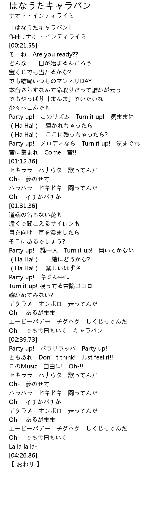 | [01:02.73] | Party up! メロディなら Turn it up! 気まぐれ |