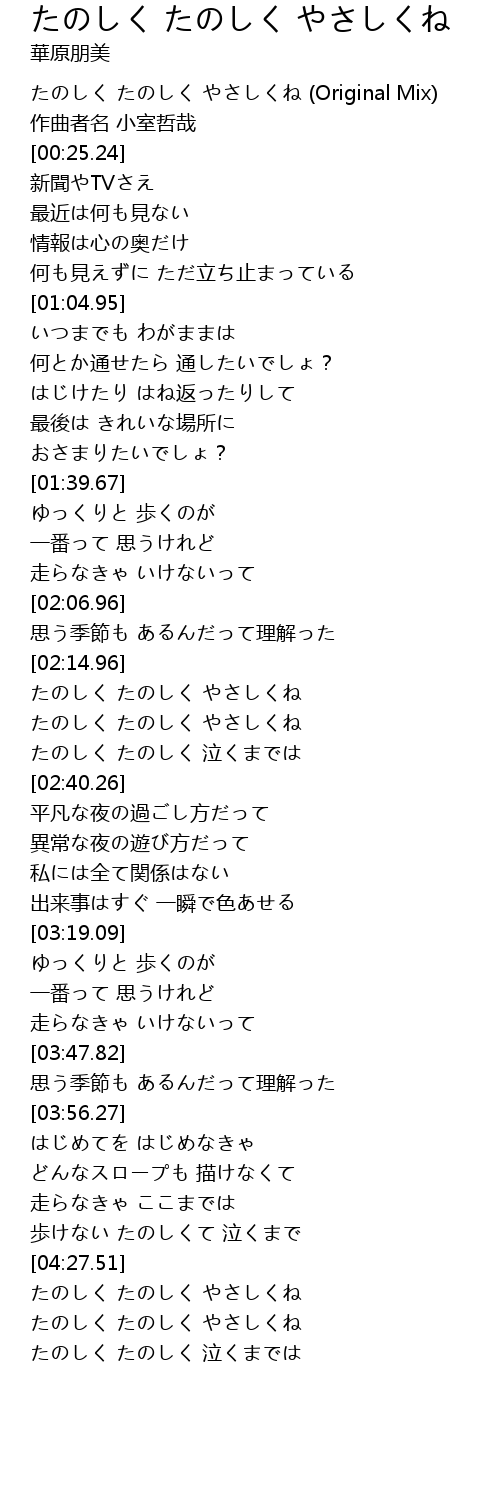 | [00:01.29] | たのしく たのしく やさしくね (Original Mix) |