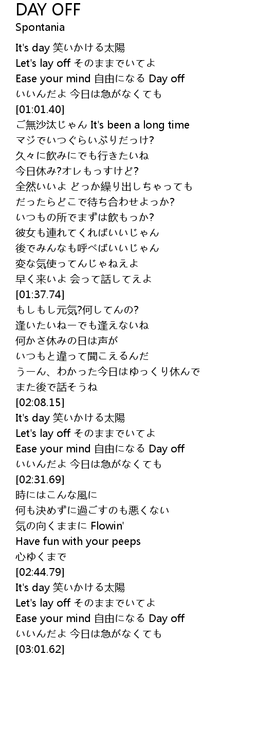 | [02:53.25] | Ease your mind 自由になる Day off |