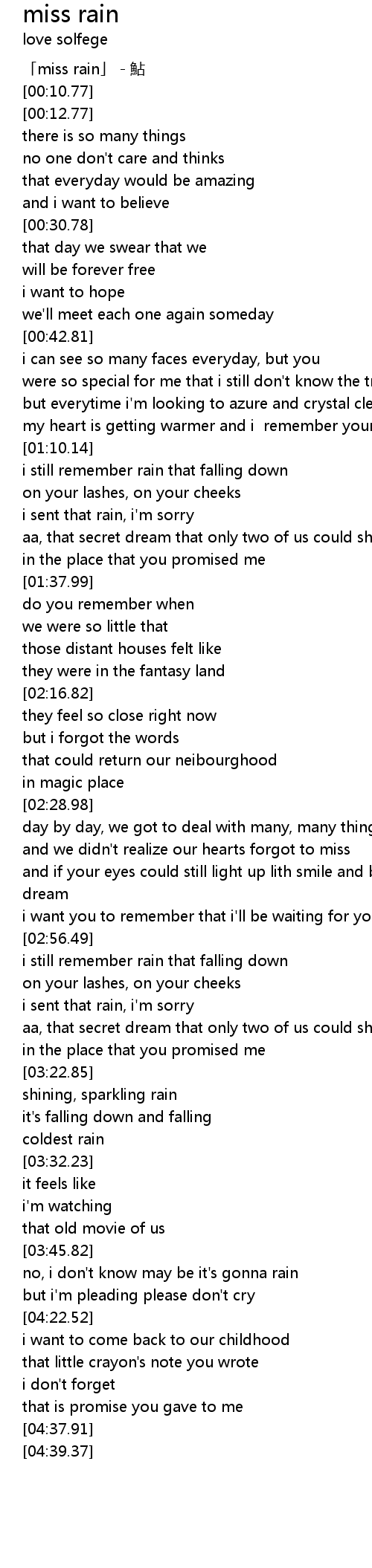 | [00:02.77] | 「miss rain」 - 鮎 |