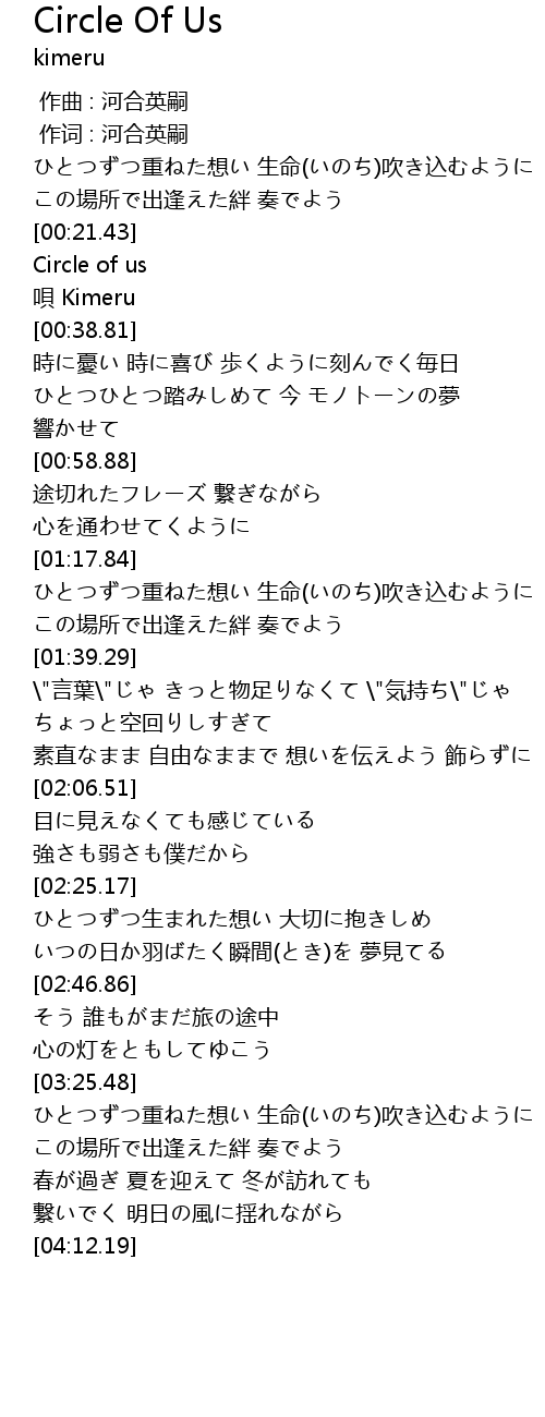 | [00:00.00] | ひとつずつ重ねた想い 生命(いのち)吹き込むように |