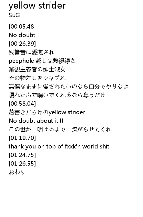 | [01:21.97] | thank you oh top of fxxk'n world shit |