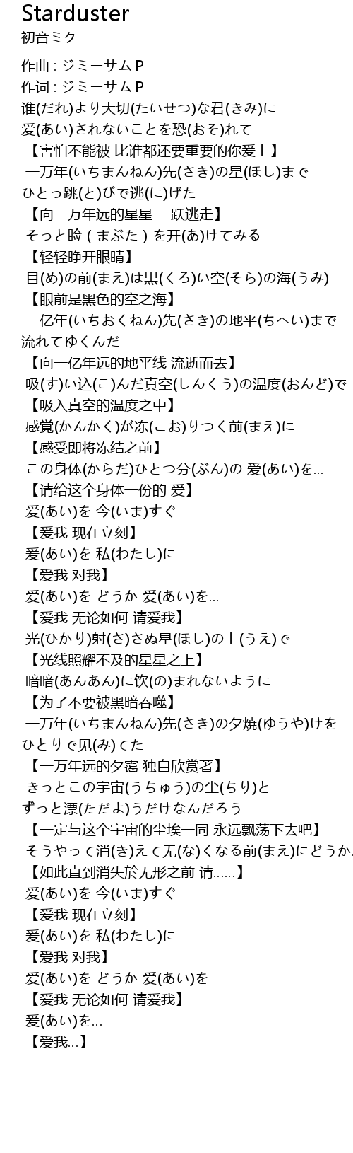 | きっとこの宇宙(うちゅう)の尘(ちり)と ずっと漂(ただよ)うだけなんだろう | |