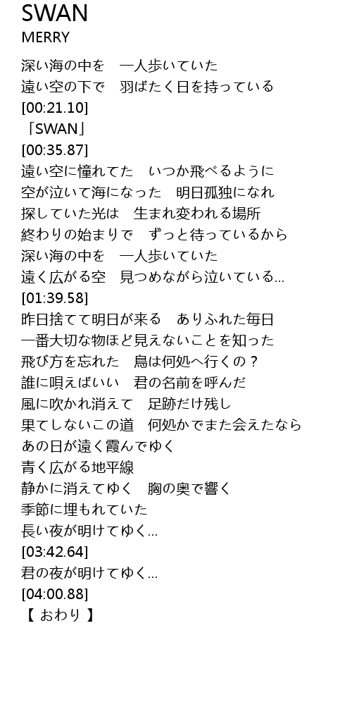 | [00:57.60] | 探していた光は 生まれ変われる場所 |