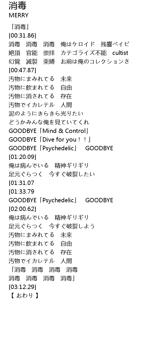 | [00:33.86] | 消毒 消毒 消毒 俺はケロイド 残響ベイビ |