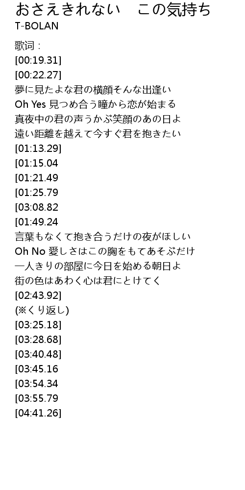 | [02:45.63][01:15.04] | ※おさえきれないこの気持ち |