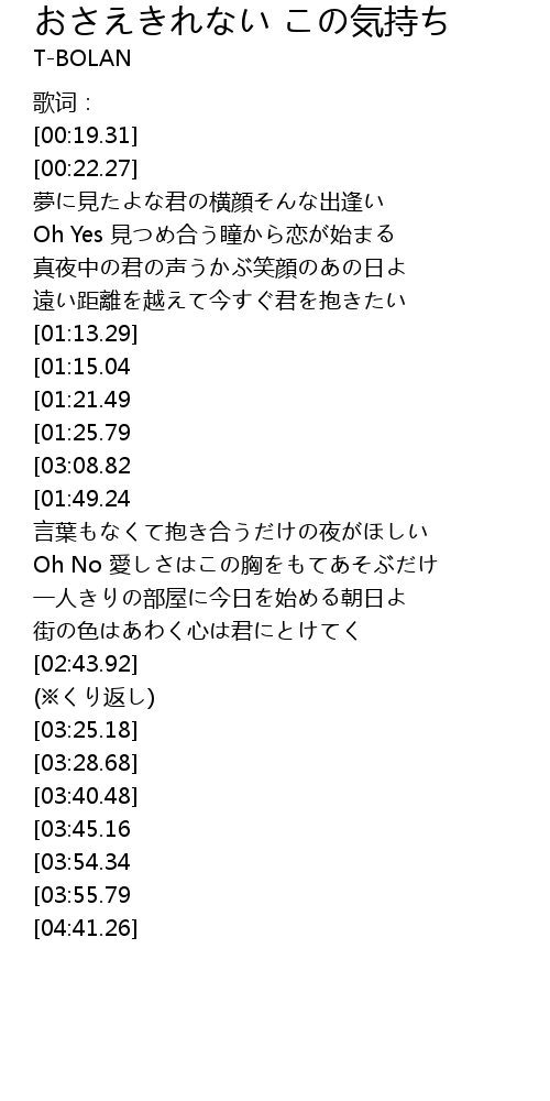 | [02:45.63][01:15.04] | ※おさえきれないこの気持ち |