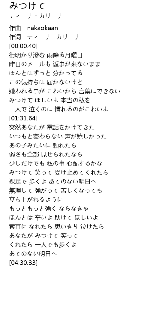 | [01:04.42] | みつけて ほしいよ 本当の私を |