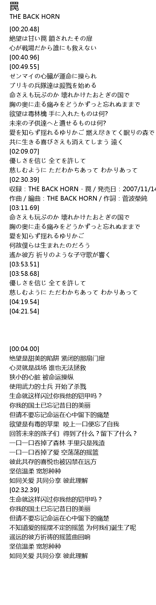 | [02:32.39] | 収録:THE BACK HORN - 罠/発売日:2007/11/14 |