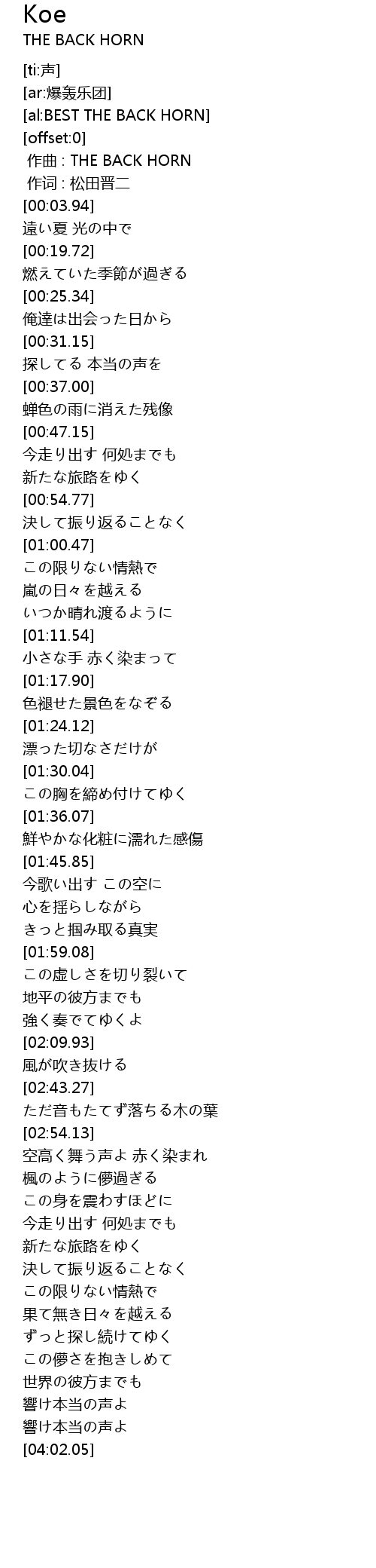| [00:00.00] | zuò qǔ : THE BACK HORN |