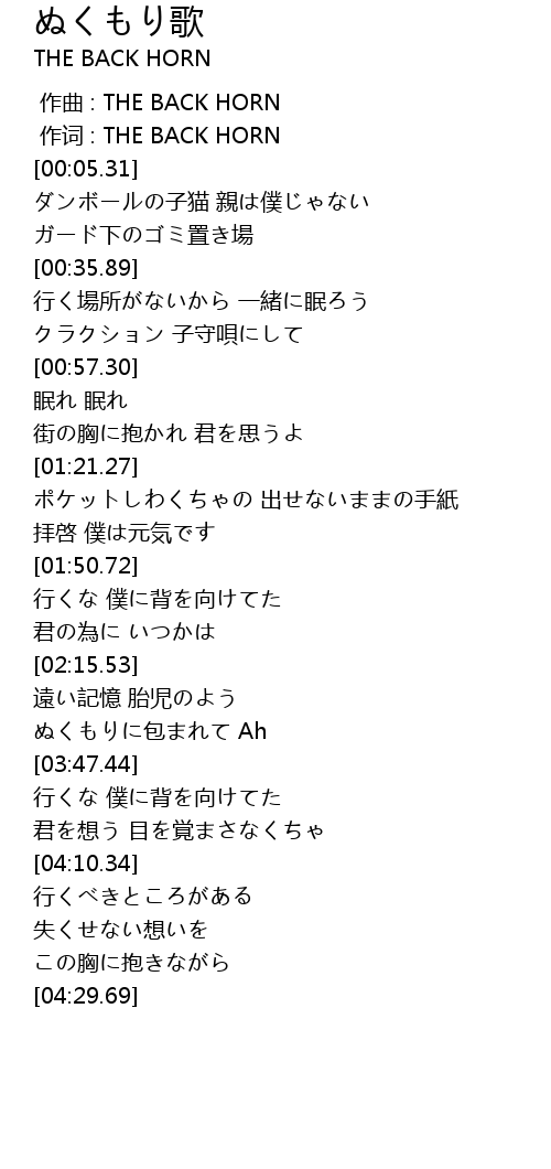 | [00:01.00] | zuò cí : THE BACK HORN |