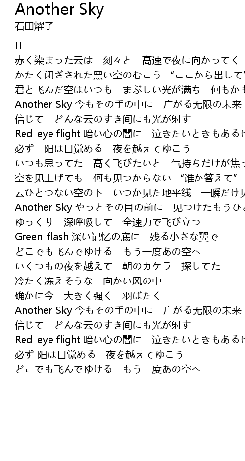| 君と飞んだ空はいつも まぶしい光が满ち 何もかも辉いてた | |