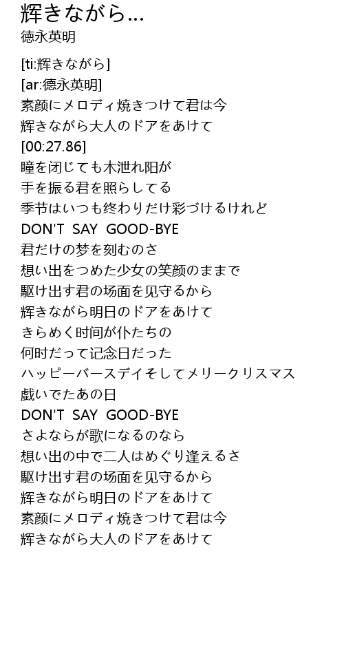 | [00:14.90] | 辉きながら大人のドアをあけて |