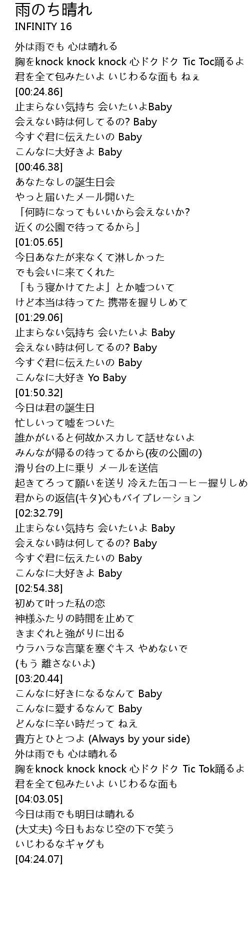 | [01:34.43] | 会えない時は何してるの? Baby |