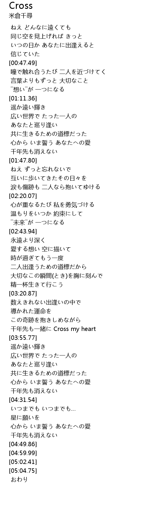 | [03:46.94] | 千年先も一緒に Cross my heart |