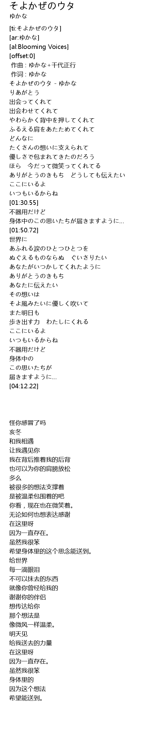 | [00:03.46] | そよかぜのウタ - ゆかな |