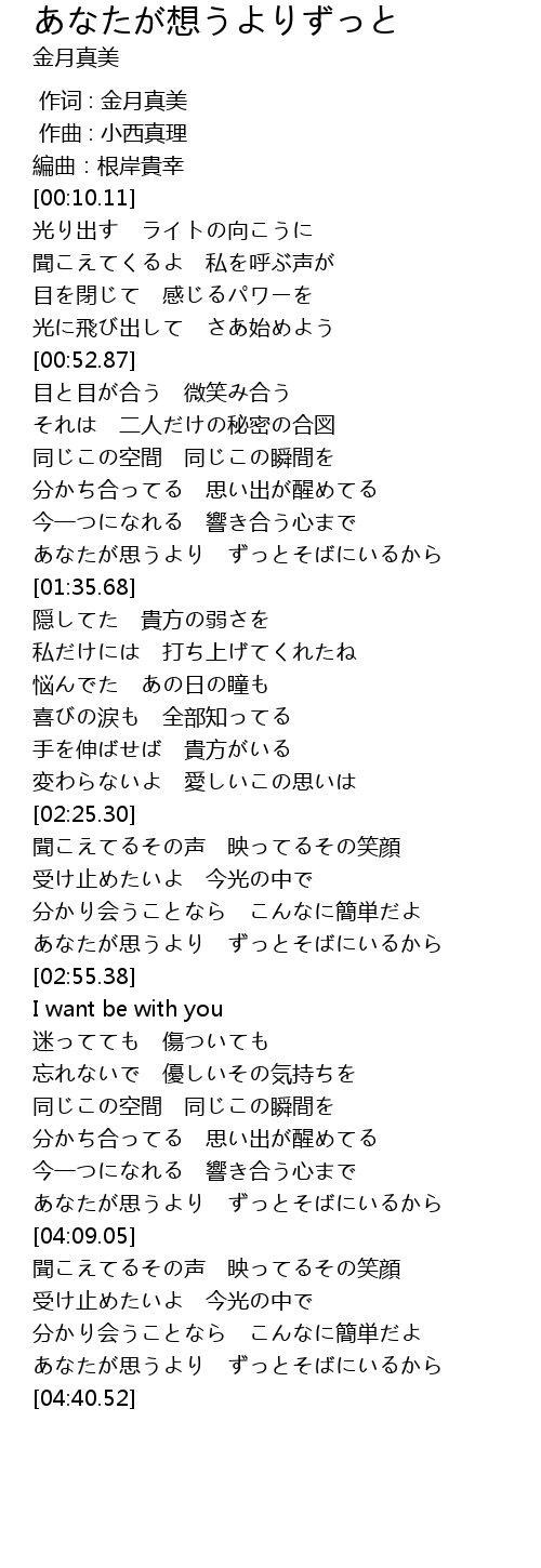 | [04:00.00] | あなたが思うより ずっとそばにいるから |