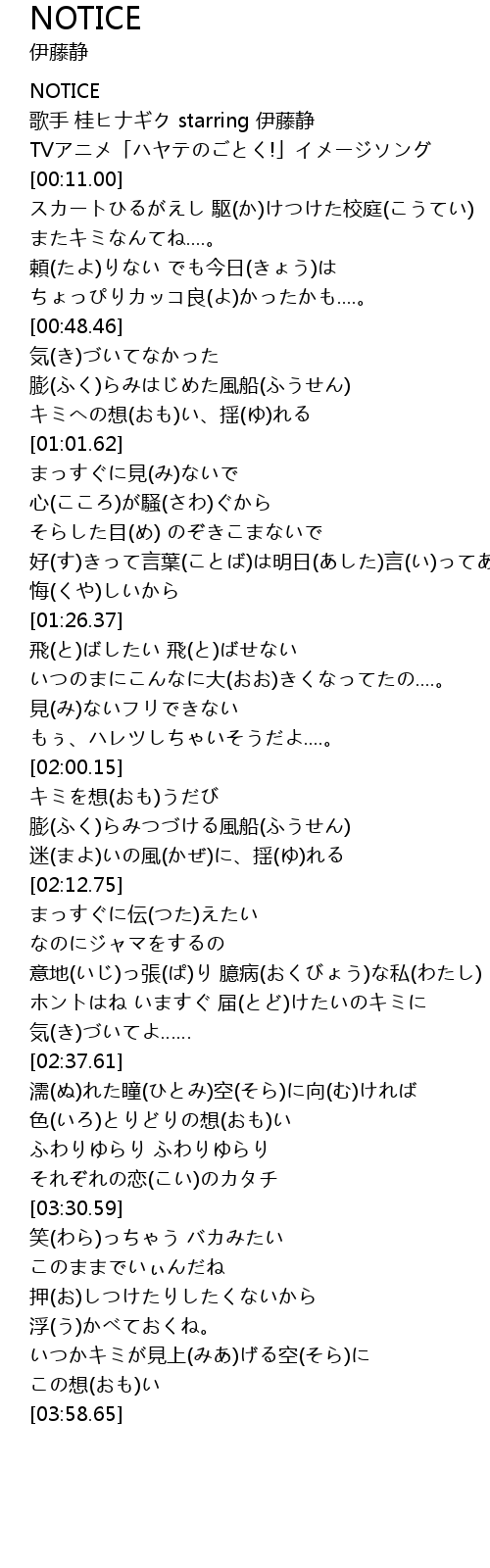 | [00:03.00] | 歌手 桂ヒナギク starring 伊藤静 |