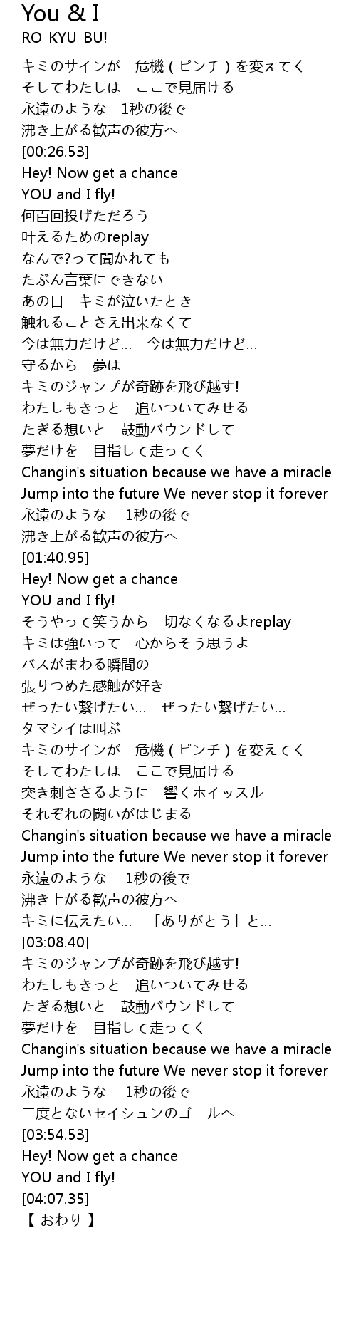 | [03:24.34] | キミのジャンプが奇跡を飛び越す! |