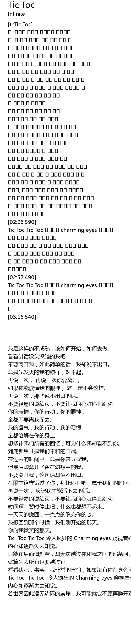 | [03:01.330] | Tic Toc Tic Toc 미쳐간다 charming eyes 훔쳐본다 |
