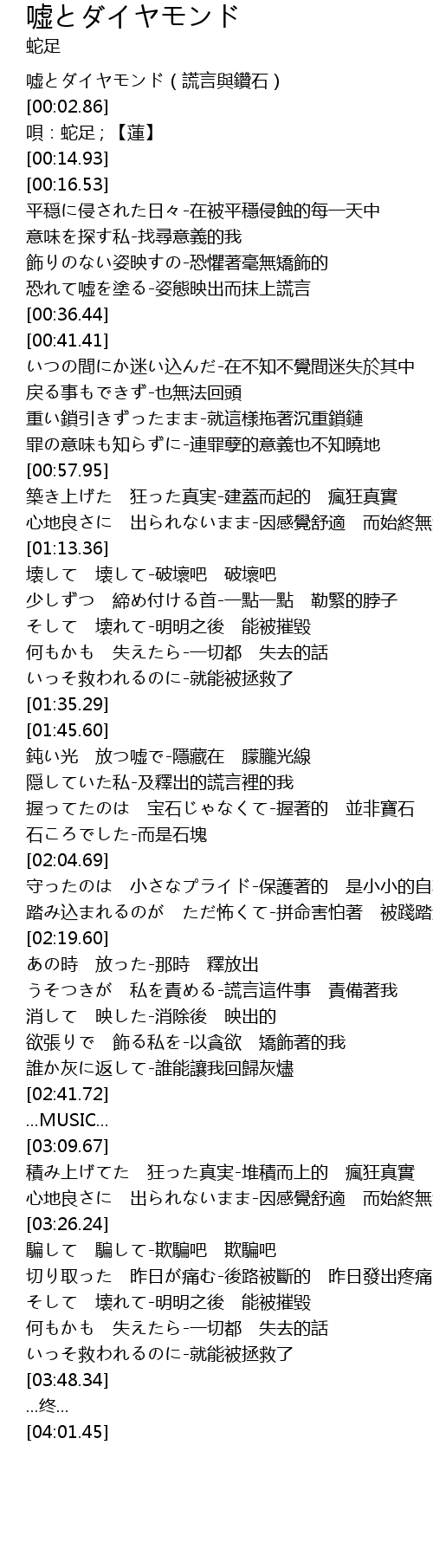 | [00:01.79] | 嘘とダイヤモンド(謊言與鑽石) |