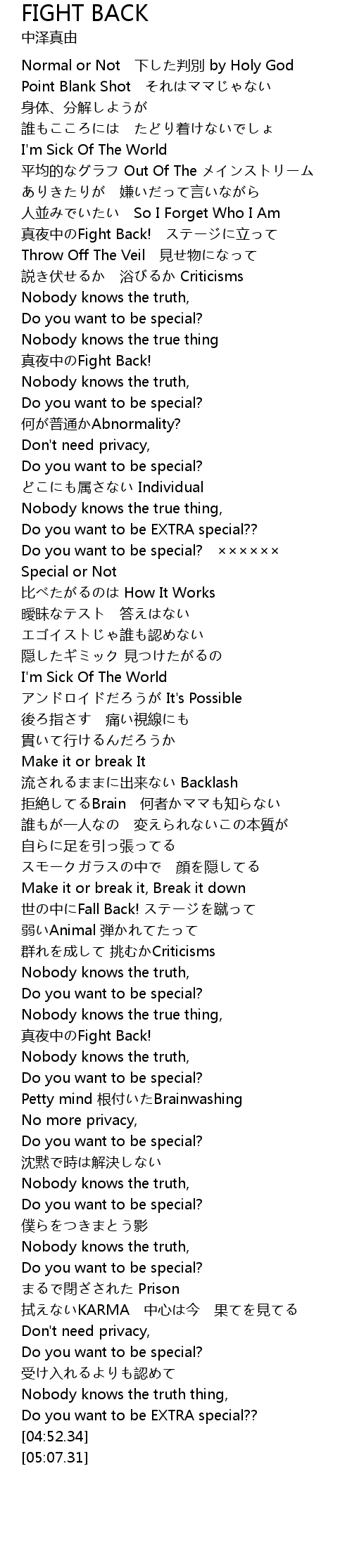 | [03:56.33] | zhēn yè zhōng Fight Back! |