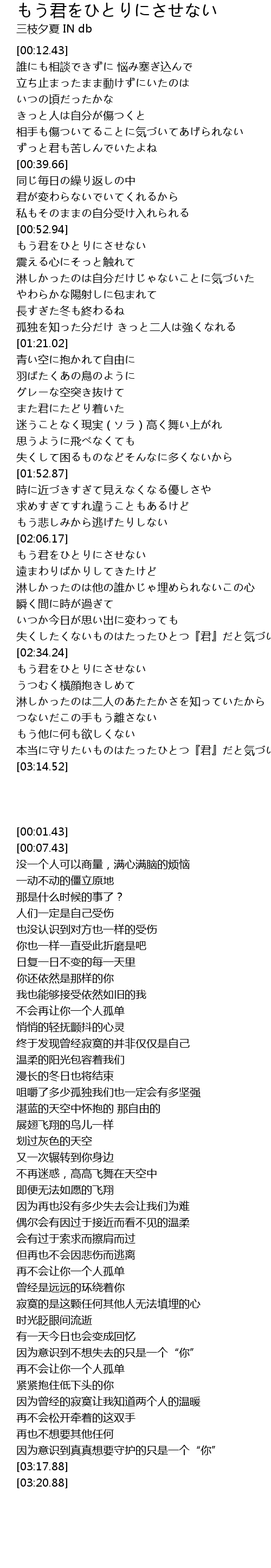 | [01:14.10] | 孤独を知った分だけ きっと二人は強くなれる |