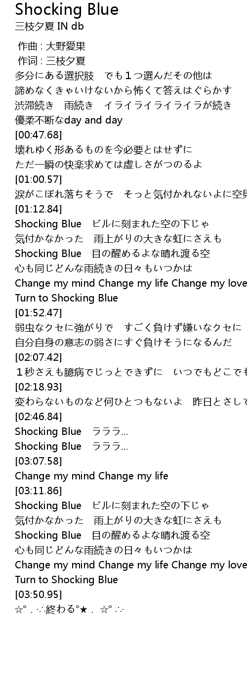 | [03:24.61] | Shocking Blue 目の醒めるよな晴れ渡る空 |