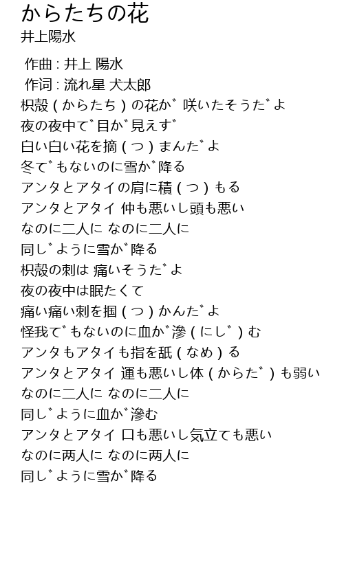 | [00:31.083] | 枳殻(からたち)の花が 咲いたそうだよ |