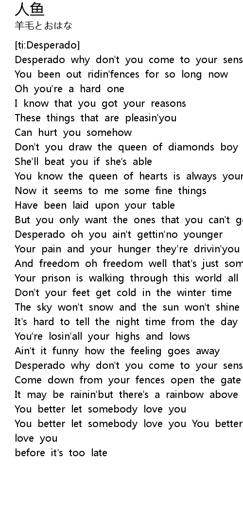 [02:22.18] Desperado why don't you come to your senses
