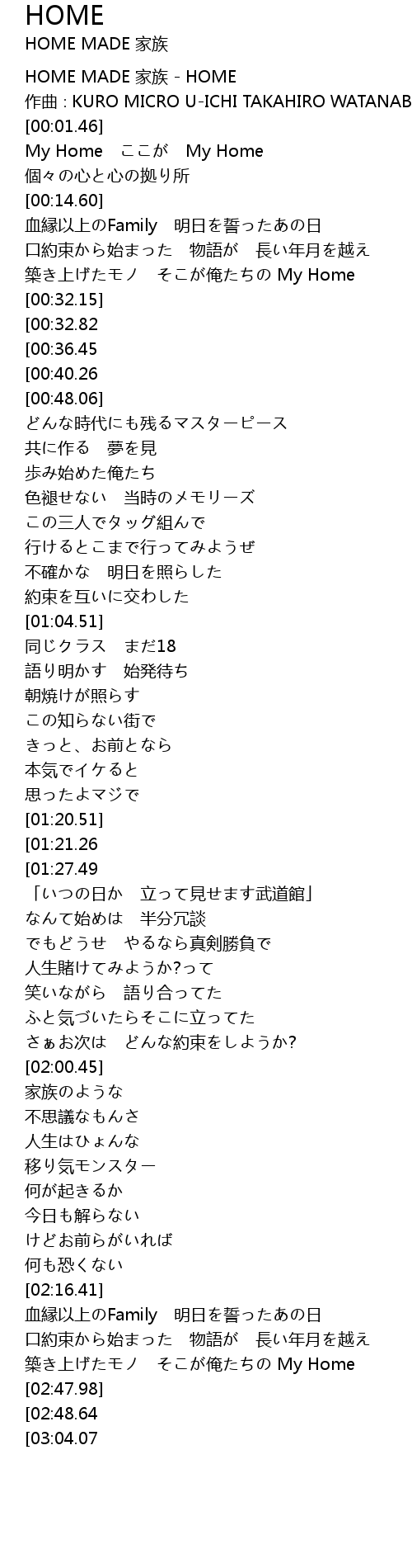 | [03:08.17][00:36.45] | My Home 家族と呼び合える場所 |