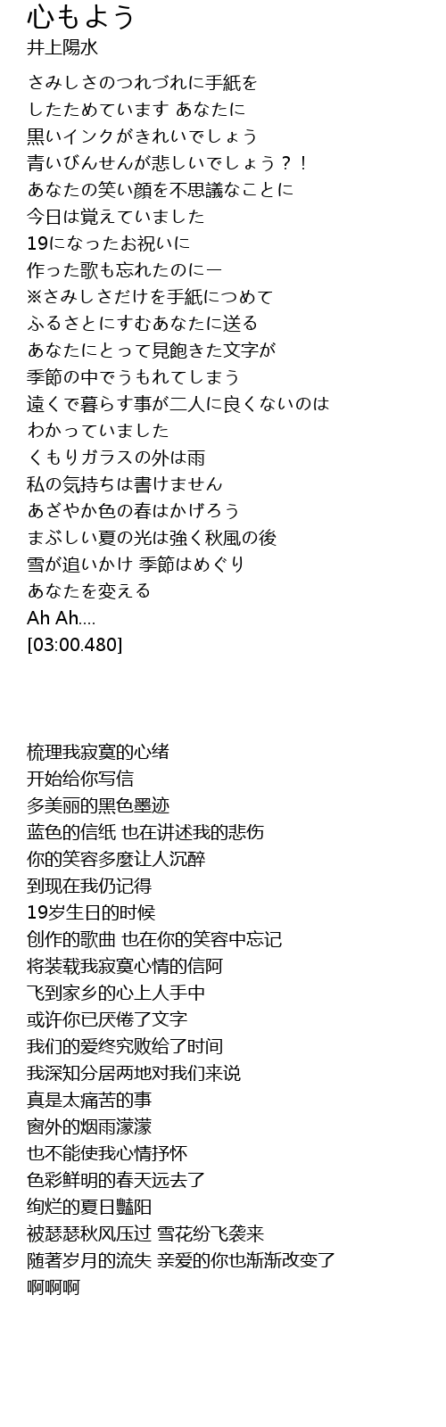 | [00:13.210] | さみしさのつれづれに手紙を |