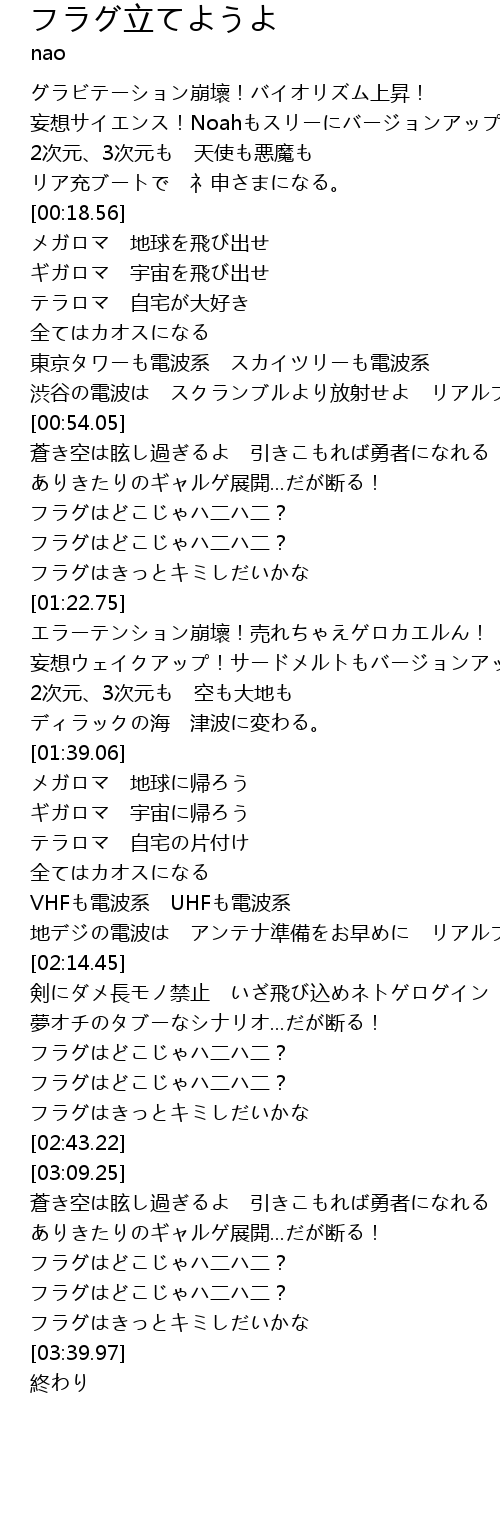 | [01:17.64] | フラグはきっとキミしだいかな |