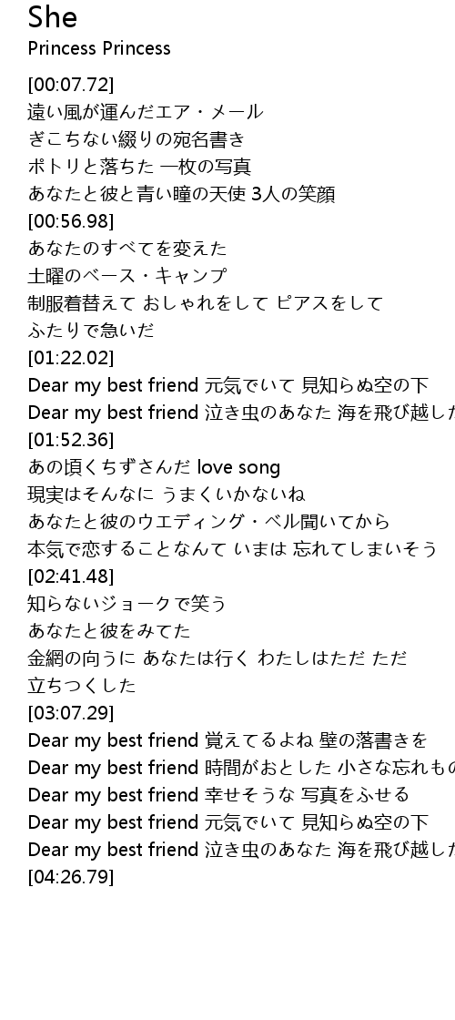 | [03:56.85] | Dear my best friend 元気でいて 見知らぬ空の下 |