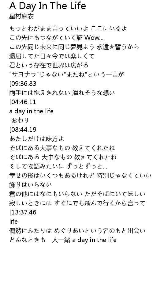 | [16:23.28][13:37.46][10:07.45] | どんな日にも君のとなり a day in the life |