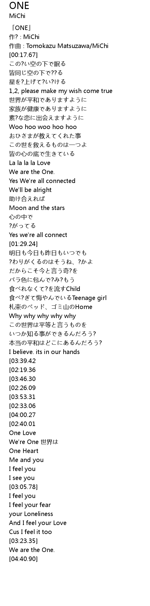 | [04:07.30][03:39.42][02:14.38] | We are the One. |